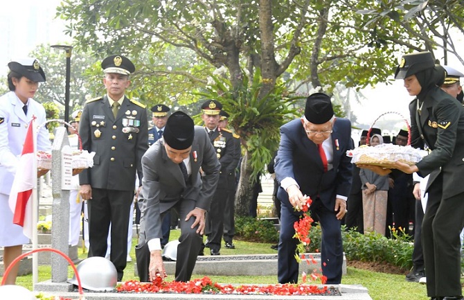 Jakarta - Presiden Joko Widodo (Jokowi) memimpin upacara ziarah nasional dalam rangka peringatan Hari Pahlawan 2023 di Taman Makam Pahlawan Nasional Utama, Kalibata, Jakarta Selatan, Jumat (10/11/2023).Presiden Jokowi didampingi Wakil Presiden (Wapres) Ma’ruf Amin tiba di lokasi sekitar pukul 08.00 WIB. Selanjutnya upacara dimulai dengan laporan Komandan Upacara Kolonel Penerbang Puguh Yulianto kepada Presiden Jokowi selaku inspektur upacara.Prosesi dilanjutkan dengan penghormatan kepada