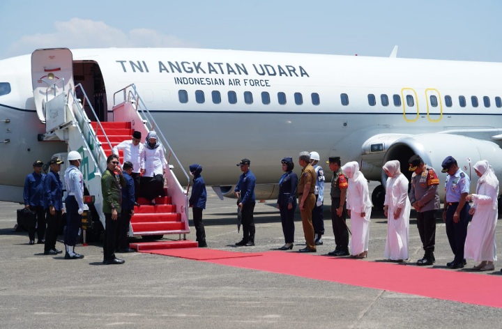 Makassar – Pangdam XIV/Hasanuddin Mayjen TNI Dr. Totok Imam Santoso, S.I.P., S.Sos., M.Tr (Han)., menyambut dan memantau kedatangan Wakil Presiden (Wapres) RI Prof. Dr.(H.C). K.H. Ma’ruf Amin didampingi Ibu Hj. Wury Mar’uf Amin beserta rombongan di Bandara Emmy Saelan Lanud Sultan Hasanuddin, Kab. Maros, Provinsi Sulawesi Selatan. Senin (9/10/2023).Tiba di Bandara, Wapres RI yang didampingi istri, Ibu Hj. Wury disambut oleh Pangdam XIV/Hasanuddin bersama Sekda Sulsel Drs. Andi