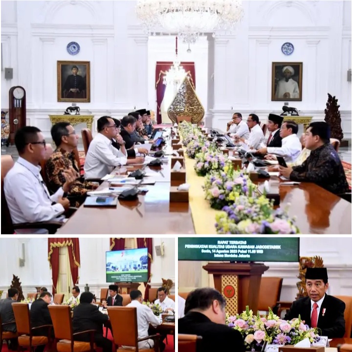 Jakarta - Buruknya kualitas udara di wilayah Jabodetabek, Presiden RI Ir H Joko Widodo (Jokowi) melakukan rapat terbatas di Istana Merdeka, Minggu (13/8/2023).Rapat terbatas tersebut membahas kualitas udara di Wilayah Jabotabek sudah buruk pada angka 156 dengan keterangan tidak sehat.Adapun beberapa faktor, antara lain kemarau panjang selama tiga bulan terakhir yang menyebabkan peningkatan konsentrasi polutan tinggi, faktor pembuangan emisi dari transportasi, dan kegiatan industri