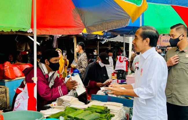Serang - Presiden RI Joko Widodo (Jokowi) langsung turun kepasar mengecek harga minyak goreng di Pasar Baros, Kabupaten Serang Jumat (17/06/2022).Selain mengecek harga minyak goreng, Presiden Jokowi juga menyerahkan sejumlah bantuan sosial bagi penerima manfaat Program Keluarga Harapan (PKH) dan para pedagang. Adapun bantuan Jokowi kepada PKH dan para pedagang yang berisikan amplop senilai Rp1,2 (juta) merupakan Bantuan Modal Kerja (BMK) bagi para penerima manfaat Program Keluarga Harapan