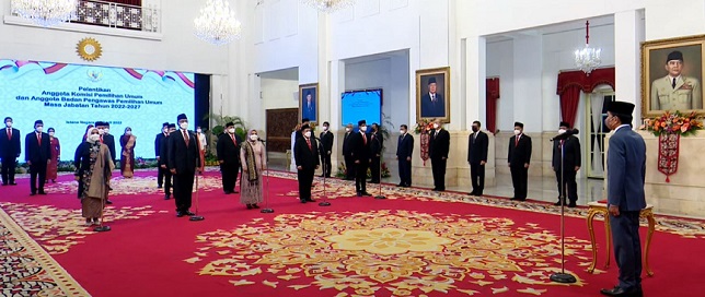Jakarta - Presiden RI Ir Joko Widodo (Jokowi) melantik dan mengambil sumpah jabatan anggota Komisi Pemilihan Umum (KPU) dan Badan Pengawas Pemilihan Umum (Bawaslu) masa jabatan tahun 2022-2027. Acara pelantikan berlangsung di Istana Negara, Jakarta Pusat, Selasa (12/04/2022) dengan menerapkan protokol kesehatan yang ketat.Pelantikan anggota KPU dilakukan berdasarkan Keputusan Presiden Republik Indonesia Nomor 33/P Tahun 2022 tentang Pemberhentian dan Pengangkatan Anggota Komisi Pemilihan Umum.