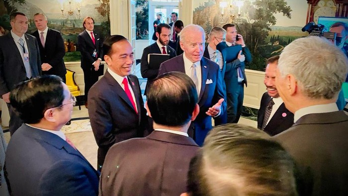 New York - Presiden RI Ir Joko Widodo (Jokowi) menghadiri jamuan santap malam antara pemimpin negara-negara ASEAN dengan Presiden Amerika Serikat Joe Biden di Gedung Putih Washington DC, Kamis malam, 12 Mei 2022 waktu setempat (WS) atau Jumat pagi, 13 Mei 2022 waktu Indonesia.Presiden Jokowi berangkat menuju Gedung Putih dari Hotel Ritz-Carlton dan tiba sekitar pukul 17.20 WS, dan langsung langsung disambut oleh Presiden AS Joe Biden.Saat dipenyambutan, Jokowi lalu kemudian bersalaman, berfoto