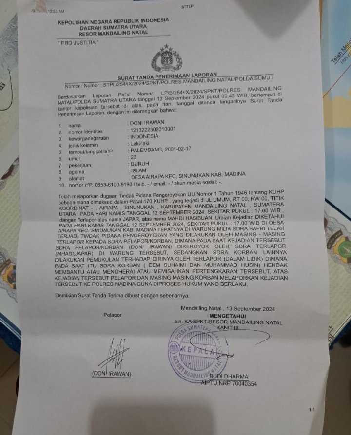 Panyabungan - Korban pengeroyokan di wilayah PT. PALMARIS RAYA atas nama Doni irawan 23 tahun warga Desa Airapa Kecamatan Sinunukan melapor ke Polres Mandailing Natal dini hari pukul 00: 43 WIB.Doni Irawan serta dua Korban lainnya Eem Suahimi dan Muhammad Husin adalah korban pengeroyokan oleh pelaku Jafar, Mahdi Hasibuan Dkk di PT. PALMARIS RAYA Sinunukan. Menurut keterangan dari Korban kejadian berawal pada hari kamis tanggal 12 September 2024, sekitar pukul 17:00 WIB tepatnya di warung