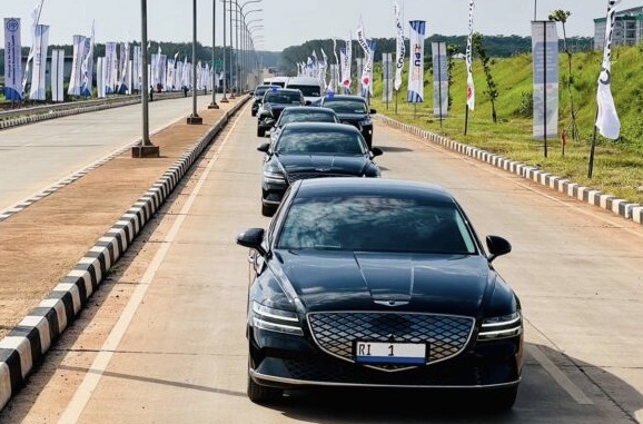Batang - Rombongan Presiden Joko Widodo (Jokowi) dan Ibu Iriana saat menuju ke Kawasan Industri Terpadu Batang (KITB) di Kabupaten Batang menaiki mobil listrik ke Provinsi Jawa Tengah, Rabu (08/06/2022). Presiden dan rombongan lalu meninjau proyek KCC Glass di KITB Jawa Tengah."Tadi saya nyoba mobil listriknya Genesis dari Hyundai. Saya kira halus, enggak ada suaranya," ujar Presiden di kawasan proyek KCC Glass.Menurut Presiden, kendaraan listrik merupakan bagian dari upaya