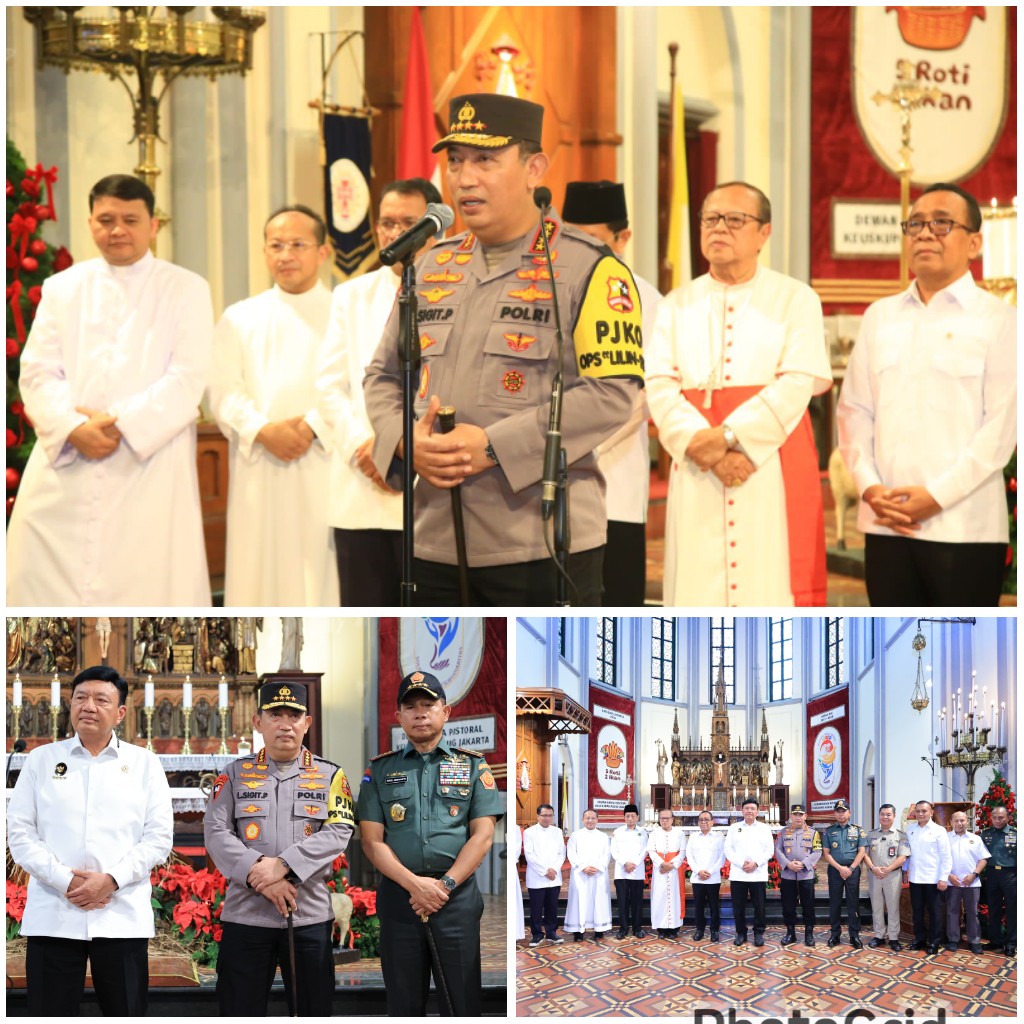 Jakarta - Kapolri Jenderal Polisi Drs. Listyo Sigit Prabowo melakukan pengecekan kesiapan personel pengamanan ibadah misa malam Natal di Gereja Katedral Jakarta. Pengecekan dilakukan sebelum dimulainya misa pertama di Gereja Katedral pukul 17.00 WIB.Pengecekan itu di lakukan bersama Menkopolkam Budi Gunawan, Menko PMK Pratikno, Menteri Agama Nasaruddin Umar, Panglima TNI Jenderal Agus Subiyanto, Pj. gubernur DKI Teguh Setyabudi, dan pejabat Forkopimda lainnya.“Kami bersama-sama dengan TNI