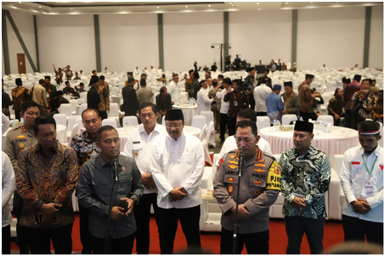 Surakarta - Ribuan mantan anggota Jamaah Islamiyah (JI) secara resmi mendeklarasikan diri kembali ke pangkuan Negara Kesatuan Republik Indonesia (NKRI) Sabtu (21/12/2024). Deklarasi ini merupakan bagian dari rangkaian kegiatan yang telah berlangsung hingga ke-45 kalinya, dengan sekitar 1.400 eks anggota JI hadir dalam acara tersebut. Sehingga total sejauh ini sudah ada 6900-an mantan anggota dari kelompok radikal yang kembali menghormati Ideologi Bangsa.Kapolri Jenderal Polisi Listyo Sigit