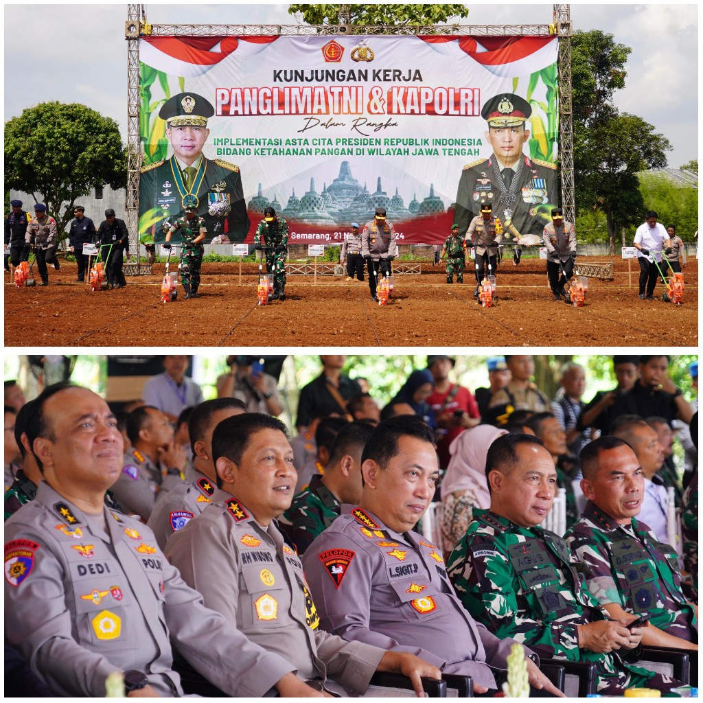 Semarang - Kapolri Jenderal Listyo Sigit Prabowo bersama Panglima TNI Jenderal Agus Subiyanto melakukan kunjungan dalam rangka Implementasi Asta Cita Presiden R.I Bidang Ketahanan Pangan di Wilayah Hukum Polda Jateng, bertempat di Lahan TNI AD Kelurahn Bulusan Kecamatan Tembalang, Kota Semarang Jawa Tengah, Kamis (21/11/2024) pagi.Dalam kunjungan tersebut, Kapolri dan Panglima TNI meninjau kesiapan jajaran Polda Jawa Tengah dan Kodam IV/Diponegoro dalam mendukung