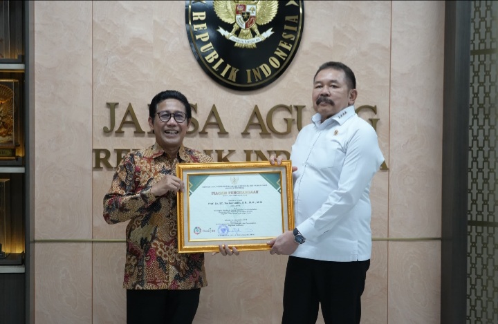 Jakarta - Jaksa Agung ST Burhanuddin menerima piagam penghargaan dari Kementerian Desa, Pembangunan Daerah Tertinggal, dan Transmigrasi (Kemendes PDTT) atas Dukungan Kejaksaan Agung RI dalam Mensukseskan Pembangunan Desa Melalui Program Jaksa Garda Desa (Jaga Desa). Piagam penghargaan tersebut tertuang dengan Nomor: 2011/KPG.02.06/2024 yang diserahkan langsung oleh Menteri Desa PDTT Abdul Halim Iskandar kepada Jaksa Agung dalam kunjungannya ke Kantor Kejaksaan Agung pada Senin 23 September