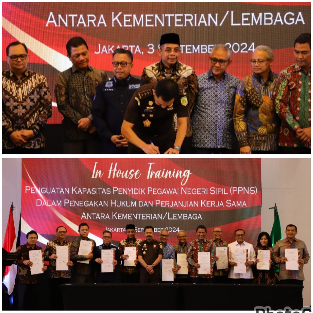Jakarta - Jaksa Agung Muda Bidang Tindak Pidana Umum (JAM PIDUM) Kejaksaan Agung melaksanakan penandatanganan Perjanjian Kerja Sama MoU) dengan beberapa Kementerian/Lembaga di Le Meridien, Jakarta, Selasa (03/8/2024).MoU ini dilaksanakan dalam rangka Penguatan dan Sinergitas Penyidik Pegawai Negeri Sipil, yang dilaksanakan pada rangkaian acara In House Training yang berlangsung pada waktu dan tempat yang sama. Adapun daftar Kementerian/Lembaga yang melaksanakan penandatanganan kerja sama