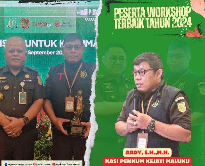 Jakarta - Puspenkum Kejagung RI bekerjasama dengan Tempo Institute, menobatkan Kasi Penkum Kejaksaan Tinggi Maluku Ardy, S.H.,M.H sebagai peserta terbaik dalam kegiatan Workshop tahun 2024 yang diselenggarakan di Hotel Oakwood and Apartments Taman Mini - Jakarta Timur.Dalam kesempatan yang dihadiri langsung oleh Kapuspenkum Dr. Harli Siregar, S.H.,M.Hum, para Kasubdit pada Puspenkum Kejagung RI serta para Narasumber dari Media Tempo, memberikan apresiasi dan penghargaan kepada beberapa