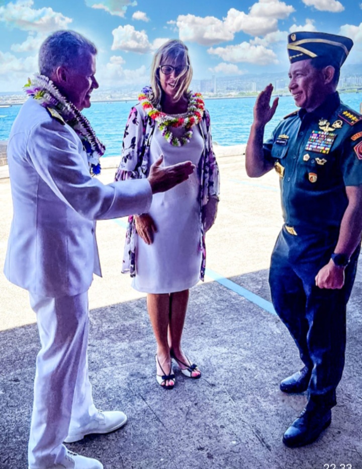 Hawaii - Panglima TNI Jenderal TNI Agus Subiyanto menghadiri upacara serah terima jabatan Komandan US INDOPACOM dari Laksamana John Aquilino kepada Laksamana Samuel J. Paparo Jr dengan inspektur upacara Menteri Pertahanan AS Lloyd J Austin III di Pangkalan US Indopacom, Joint Pearl Harbour-Hickam, Hawaii, AS, Jumat (3/05/2024).Kehadiran Panglima TNI pada acara ini menjadi salah satu bentuk komitmen dan pengejawantahan erat dalam meningkatkan hubungan kerjasama antara TNI dan militer AS yang