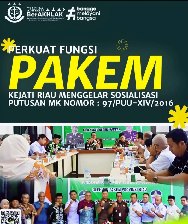 Bangkinang - Kejaksaan Tinggi Riau melalui Kasi B bidang Intelijen Kejaksaan Tinggi Riau menggelar Sosialisasi Putusan Mahkamah Konstitusi Nomor 97/PUU-XIV/2016.Sosialisasi Putusan Mahkamah Konstitusi Nomor 97/PUU-XIV/2016tersebut digelar pada hari Rabu tanggal 20 September 2023 sekira pukul 10.00 WIB di Aula Kantor Kejaksaan Negeri Kampar yang langsung disosialisasika oleh Kasi B bidang Intelijen Kejaksaan Tinggi Riau Ali Rahim, SH MH.Kegiatan sosialisasi tersebut dihadiri oleh : Ali