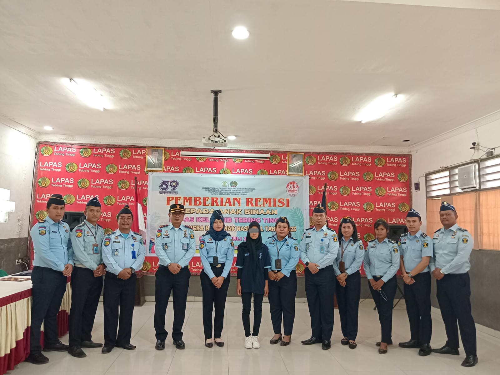 Tebing Tinggi - Dalam rangka memperingati Hari Anak Nasional Tahun 2023, Kementerian Hukum dan Hak Asasi Manusia Republik Indonesia (Kemenkumham RI) memberikan remisi kepada sejumlah anak didik pemasyarakatan (andikpas), Minggu, 23/07/2023.Bertempat di aula Sasana Tama Lembaga Pemasyarakatan (Lapas) Kelas IIB Tebing Tinggi, pagi ini Kepala Lembaga Pemasyarakatan (Kalapas) Anton Setiawan menyerahkan Surat Keputusan Remisi Anak kepada 1 (satu) orang andikpas Lapas Tebing Tinggi. Kegiatan ini