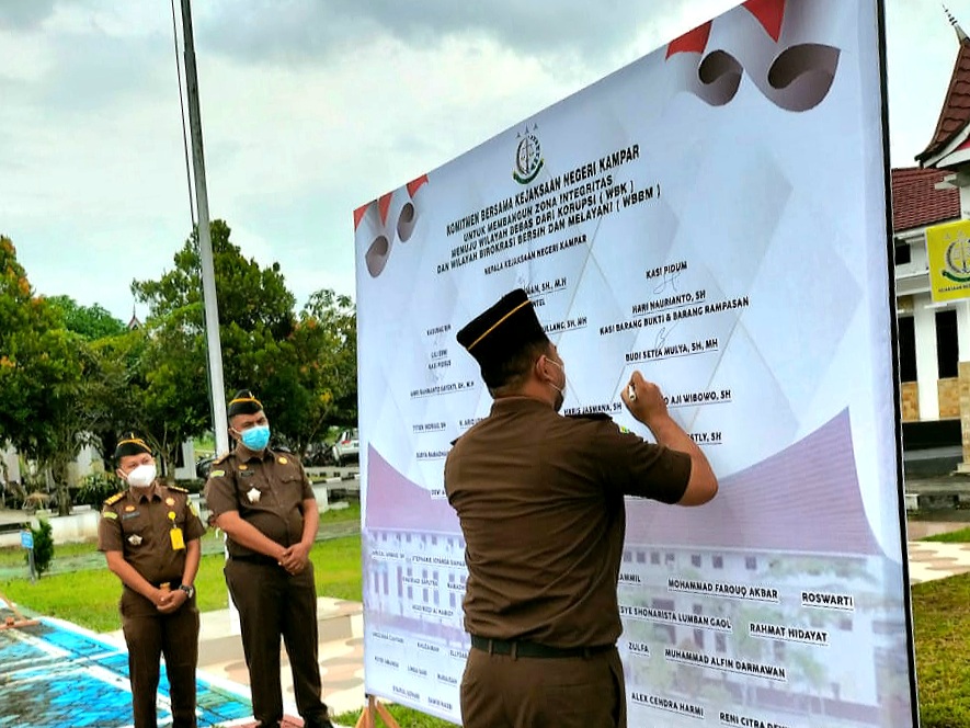 Bangkinang - Kejaksaan Negeri (Kejari) Kampar menggelar apel penandatanganan Pencanangan Pembangunan Zona Integritas menuju wilayah bebas dari korupsi (WBK) dan Wilayah Birokrasi Bersih dan Melayani (WBBM) , sesuai Instruksi Jaksa Agung (JA) Republik Indonesia. Acara digelar dilapangan Kantor Kejari Kampar, Bangkinang, Senin (14/3/2022).