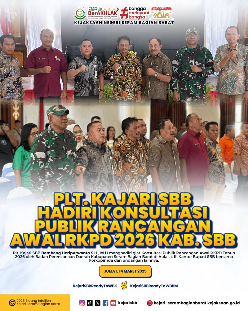 Seram Bagian Barat - Plt Kajari SBB Bambang Heripurwanto S.H., M.H menghadiri giat Konsultasi Publik Rancangan Awal RKPD Tahun 2026 oleh Badan Perencanaan Daerah Kabupaten Seram Bagian Barat (SBB) di Aula Lt. III Kantor Bupati SBB bersama Forkopimda dan undangan lainnya.Dalam rangka memperkuat pembangunan berkelanjutan dan memberi kesejahteraan rakyat tentunya perlu dilaksanakan konsultasi publik agar dapat mengetahui apa saja kendala maupun kebutuhan yang perlu ditindak lanjuti melalui