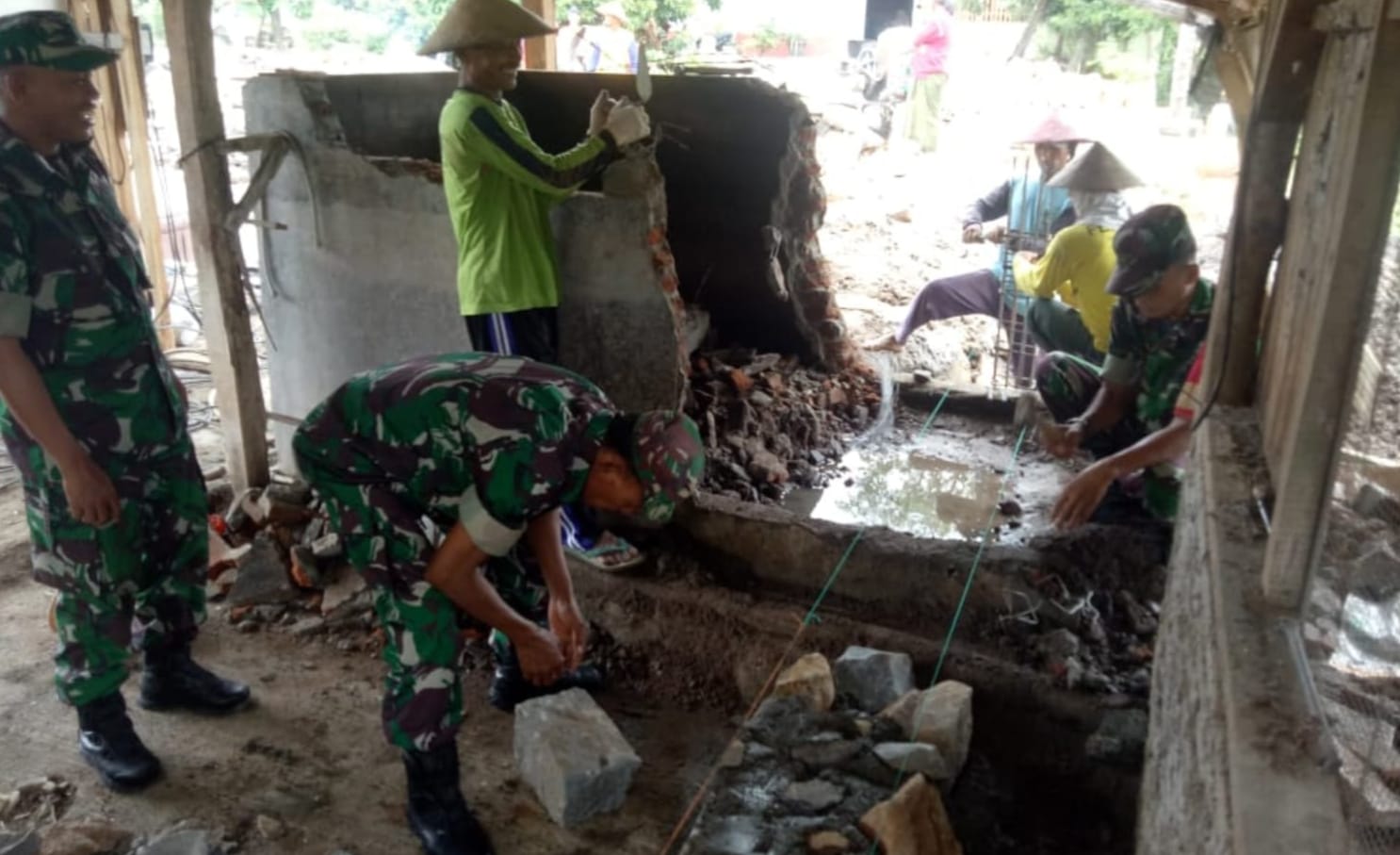 Sragen - Sertu Wiyono Babinsa Ds Cemeng beserta Anggota Koramil Sambungmacan Kodim 0725/Sragen kembali menunjukkan kepeduliannya terhadap masyarakat. Kali ini, Sertu Wiyono membantu pembangunan pondasi rumah milik warga Bapak Suminto. Aksi nyata ini menjadi bukti nyata kemanunggalan TNI dan rakyat.Pembangunan pondasi rumah tersebut dilakukan secara gotong royong. Babinsa, bersama warga sekitar, bahu-membahu mengerjakan pekerjaan berat ini. Mereka bekerja dengan