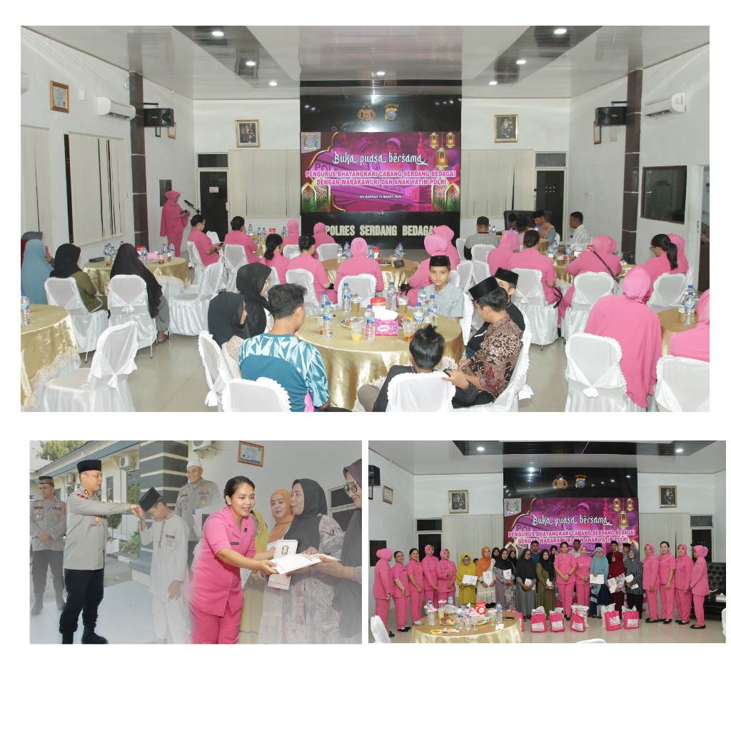 Sergai - Kapolres Serdang Bedagai AKBP Jhon Sitepu, S.I.K., MH bersama Ibu Ketua Bhayangkari buka Puasa Bersama serta Santuni Warakawuri dan Anak Yatim bertempat di Aula Patriatama Polres Serdang Bedagai, Rabu (12/03/2025). Dalam hal ini Kapolres Serdang Bedagai AKBP Jhon Sitepu, S.I.K .,M.H menyampaikan bahwasannya Polres Serdang Bedagai mengadakan kegiatan ini bertujuan untuk mempererat tali silaturahmi antara polres Serdang Bedagai terhadap bapak ibu Warakauri dan anak-anak Yatim Piatu