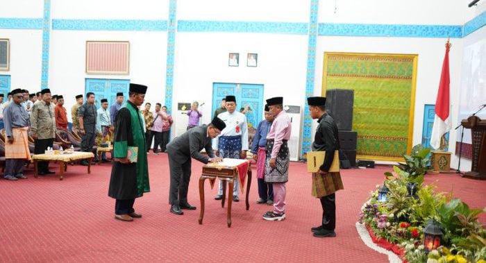 Pelalawan - Bupati Pelalawan H. Zukri pimpin pelantikan dan pengambilan sumpah jabatan kepada Sekretaris Daerah Kabupaten Pelalawan H. Abdul Karim, SH, M.Si, di Gedung Daerah Datuk Laksemana Mangkudiraja, Pangakalan Kerinci, Jumat (7/723). Diketahui sebelumnya, Sekretaris Daerah Kabupaten Pelalawan H. Tengku Mukhlis telah meninggal dunia pada 25 Juni 2023 yang lalu. Mengawali sambutannya, Bupati Pelalawan H. Zukri mengajak seluruh hadirin untuk bersama membacakan surah Al-fatihah untuk