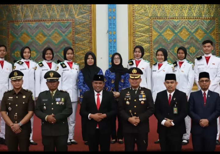Pelalawan - Pemerintah Kabupaten Pelalawan laksanakan upacara Peringatan Hari Lahir Pancasila 1 Juni 2023 di Gedung Daerah Laksamana Mangku Diraja, peringatan hari lahir Pancasila dengan mengangkat tema "Gotong Royong Membangun Peradaban dan Pertumbuhan Global".Sejatinya upacara Pelaksanaan peringatan hari lahir Pancasila akan di adakan di lapangan upacara kantor Bupati Pelalawan, namun hujan tak kunjung berhenti. Pelaksanaan upacara dilanjutkan di dalam gedung Daerah Laksamana