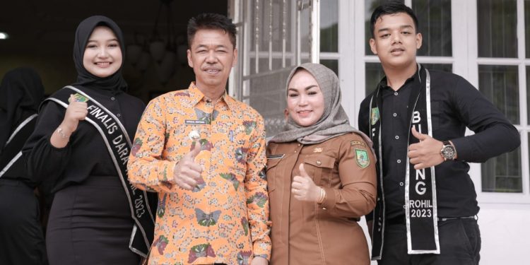 Rohil – Bupati Rokan Hilir Afrizal Sintong menggelar acara ramah tamah dengan finalis Bujang dan Dara tingkat Kabupaten Rohil, Selasa (6/6/2023) di mess Pemda Rohil. Sebanyak 30 peserta terdiri dari 15 Bujang dan 15 Dara bertanding di grand final pada 7 Juni besok di Gedung serbaguna.Acara ramah tamah itu ditandai dengan pemasangan selempang secara simbolis oleh Bupati Rohil Afrizal Sintong didampingi Ketua PKK Sanimar Afrizal dan Kepala Dinas Pariwisata Pemuda Budiman dan Olahraga serta
