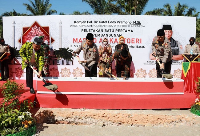 Pekanbaru - Wakapolri Komjen Gatot Edy Pramono melakukan peletakan batu pertama pertanda dimulainya pembangunan masjid Al Kastoeri di jalan Sejahtera Kelurahan Agrowisata Rumbai Barat Pekanbaru pada Selasa (27/6/2022).Masjid yang rencananya dibangun seluas 1.300 meter persegi tersebut sebagai wujud rasa syukur keluarga besar Komjen Gatot Edy Pramono.Dalam sambutannya, Komjen Gatot menyampaikan, masjid yang dibangun ini merupakan niatan dari keluarga."Saya awalnya meminta adik saya untuk mencari