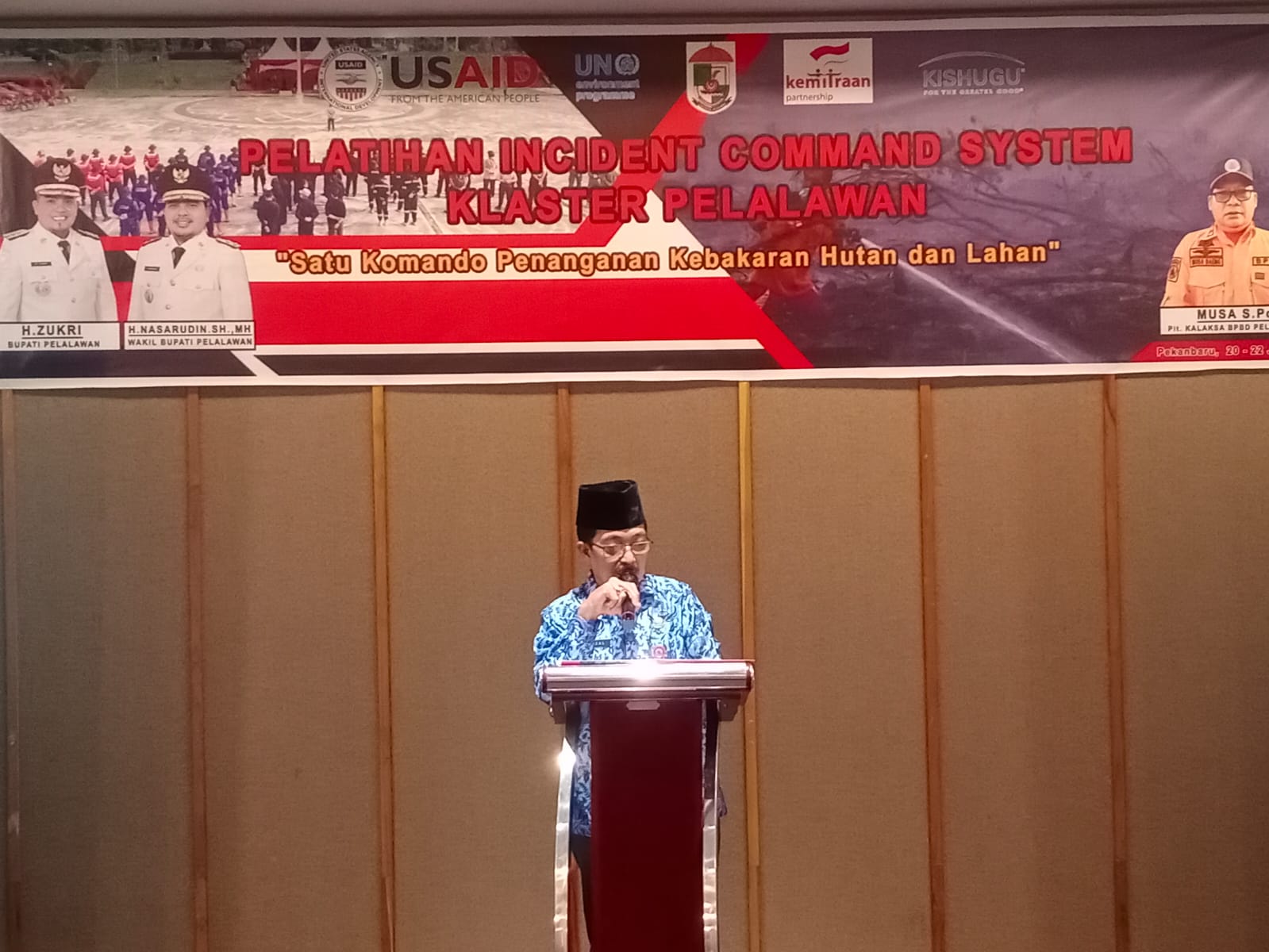 Pekanbaru - Bupati Pelalawan diwakili oleh Assisten I Setda Ir Arizal hadiri Gelaran Pelatihan Incident Command System (ICS) bagi Klaster di ruang rapat hotel Batiqa Jl Sudirman Pekanbaru, Senin (20/6/2022).Arizal membacakan sambutan dari Bupati Pelalawan H. Zukri, lewat dukungan perusahaan serta kuatnya peran aktif dari TNI dan Polri merupakan modalitas yang sangat besar dalam pengendalian kebakaran hutan dan lahan (Karhutla) di Kabupaten Pelalawan."Dengan modal inilah Pelalawan ditunjuk