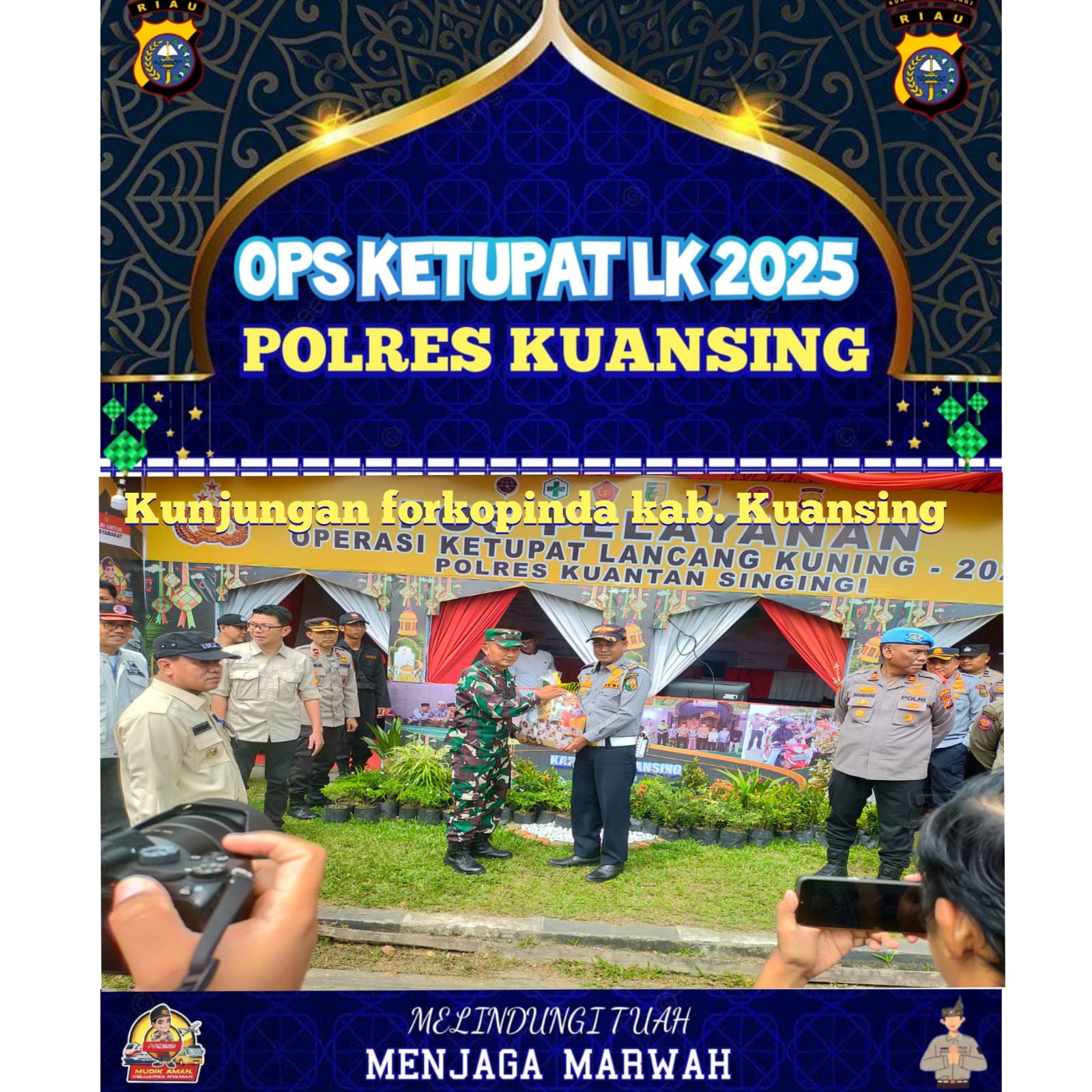 Kuansing - Polres Kuansing menyelenggarakan kegiatan kunjungan oleh Forkopimda Kabupaten Kuansing ke Pos Pam Ketupat Lancang Kuning Tahun 2025 yang berlokasi di Kecamatan Kuantan Tengah, Kabupaten Kuansing Pada hari Jumat (28/3/2025) pukul 10.00 WIB. Kunjungan ini merupakan bagian dari rangkaian kegiatan Ops Ketupat Lancang Kuning 2025 untuk memastikan kesiapan dan keamanan pelaksanaan Pos Pelayanan Lebaran.Dalam kunjungan tersebut, Bupati Suhardiman Amby didampingi oleh pejabat sebagai