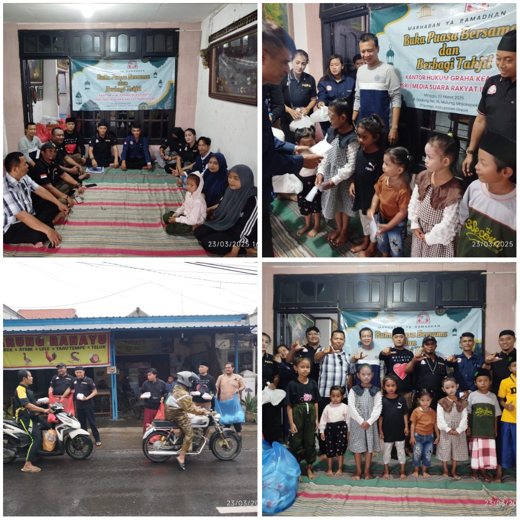 Greaik - Media Suara Rakyat Indonesia (MSRI) bersama Kantor Hukum Graha Keadilan gelar acara buka bersama dan berbagi santunan kepada anak yatim piatu, yang bertempat di Kantor Hukum Graha Keadilan, yang berada di Jalan Raya Gadung no 16, Mulung, Mojokepek, Driyorejo, Kabupaten Gresik Jawa Timur. Acara ini bertemakan "BUKA PUASA RAMADHAN SERTA BERBAGI KEPADA ANAK YATIM PIATU, hal tersebut merupakan bagian dari kegiatan sosial untuk membantu dan mendukung anak-anak yatim piatu, Minggu