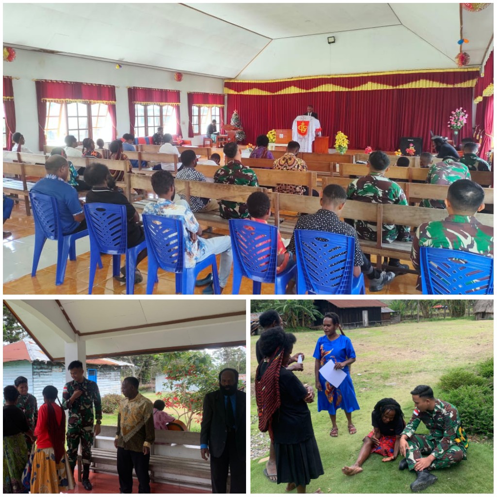 Jayawijaya - Minggu penuh suka cita, Satgas Pamtas Kewilayahan Yonif 641/Bru Pos Bolakme melaksanakan ibadah bersama warga di Gereja GKI Jemaat Damai Distrik Bolakme, Kabupaten Jayawijaya, Papua Pegunungan, Minggu (23/03/2025).Ibadah bersama dengan warga masyarakat ini rutin dilaksanakan setiap minggu di gereja yang berada di Distrik Bolakme, kali ini Satgas Yonif 641/Bru melaksanakan ibadah bersama dan dilanjutkan silahturahmi dengan jemaat GKI.Danpos Bolakme Lettu Inf Jhon Arthur Hamonangan