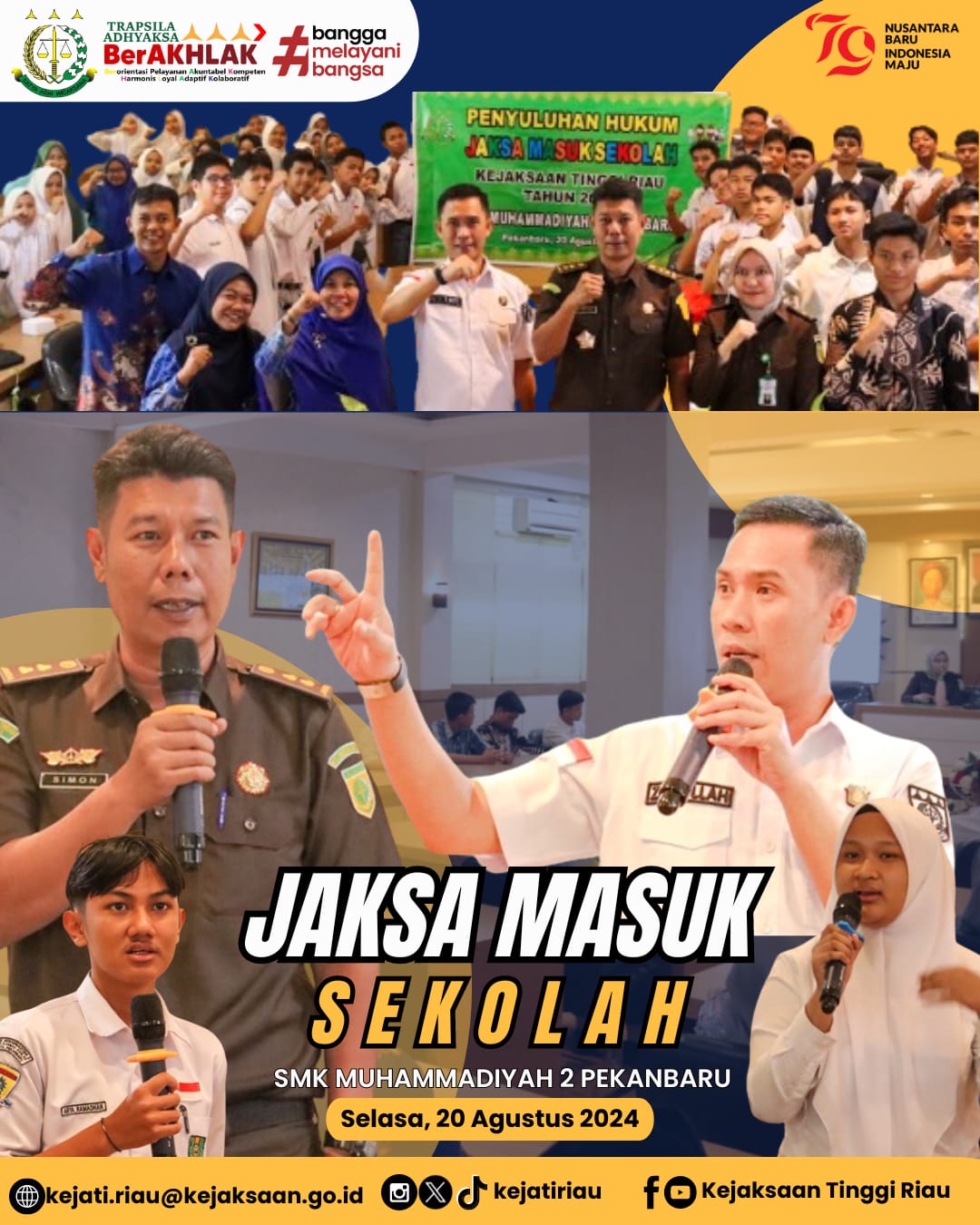 Pekanbaru - Kejaksaan Tinggi Riau menggelar penyuluhan hukum program "Jaksa Masuk Sekolah" bertempat di SMK Muhammadiyah 2 Kota Pekanbaru, Selasa (20/08/2024).Adapun kegiatan tersebut dipimpin langsung oleh Kepala Seksi Penerangan Hukum Kejaksaan Tinggi Riau Zikrullah, S.H., M.H dan dihadiri oleh Kepala Seksi Ideologi, Politik, Pertahanan dan Keamanan Bidang Intelijen pada Kejaksaan Tinggi Riau Simon, S.H., M.H sebagai narasumber serta diikuti oleh majelis guru dan siswa/i SMK Muhammadiyah 2