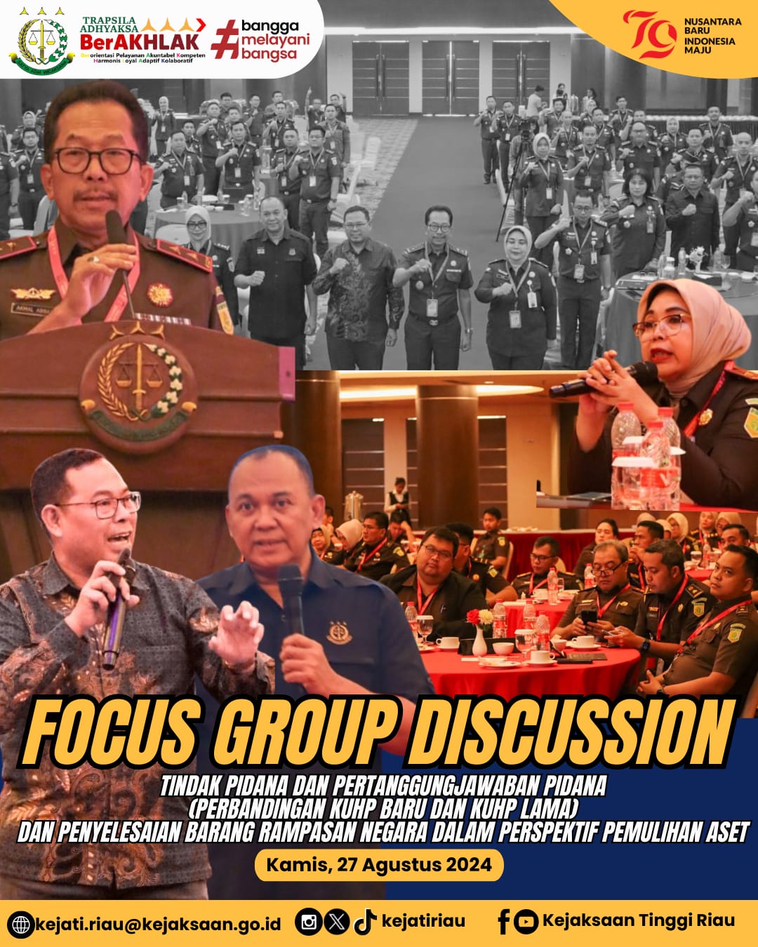 Pekanbaru - Kejaksaan Tinggi (Kejati) Riau menggelar diskusi Focus Group Disscussion (FGD) untuk membahas perubahan dalam Kitab Undang-undang Hukum Pidana (KUHP) yang baru dan bagaimana hal ini berdampak pada penanganan tindak pidana serta upaya pemulihan aset negara.Kegiatan yang berlangsung di Hotel Grand Central Pekanbaru, Kamis (29/8) ini dibuka langsung oleh Kepala Kejati (Kajati) Riau, Akmal Abbas. Dalam sambutannya, Akmal menekankan pentingnya memahami perubahan dalam KUHP baru bagi para