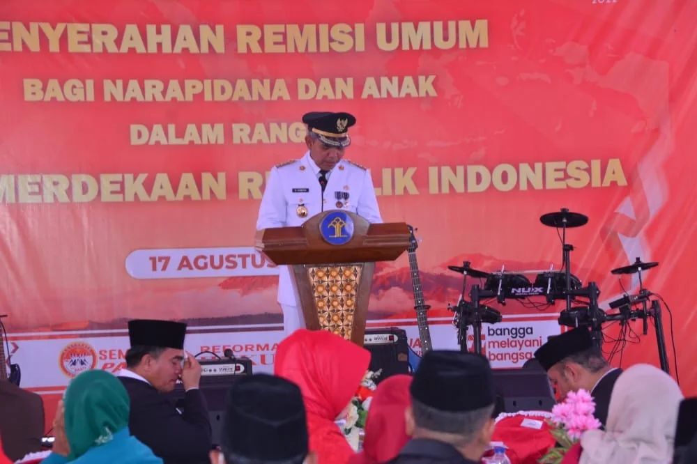 Bangkinang - Sempena memperingati Hari Kemerdekaan Republik Indonesia ke -77 tahun 20222, Penjabat (PJ) Bupati Kampar Dr Kamsol, MM menyerahkan Remisi kepada 1278 Napi dan Anak.Kegiatan penyerahan Remisi bagi Nara Pidana (Napi) dan anak diselenggarakan di Lembaga Kemasyarakatan kelas II A Bangkinang, Rabu (17/8/2022).Pj Bupati Kampar dalam sambutannya mengatakan, Pemerintah melalui Kementerian Hukum dan HAM memberikan remisi kepada 168.916 (seratus enam puluh delapan ribu sembilan ratus enam