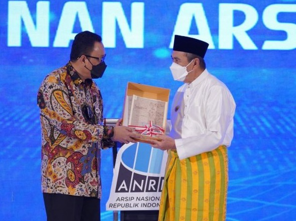 Pekanbaru - Gubernur Riau (Gubri), Syamsuar menerima dokumen salinan arsip kerajaan di Provinsi Riau yang diserahkan Kepala Arsip Nasional Republik Indonesia (ANRI), Imam Gunarto, di Hotel Pangeran Pekanbaru, Selasa (17/5/2022).Gubri Syamsuar juga berterima kasih kepada ANRI, yang telah mendokumentasikan kearsipan kerajaan yang ada di semua daerah di Provinsi Riau sebagai baukti sejarah."Dokumen ini sangat dibutuhkan oleh masyarakat terutama pemangku adat istiadat yang ada di kabupaten dan kota