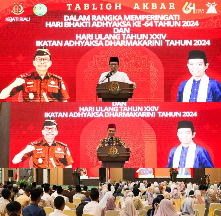 Pekanbaru - Kejaksaan Tinggi Riau menggelar Tabligh Akbar bersama Prof. Abdul Somad, L.C, D.E.S.A, Ph. D dalam rangka memperingati Hari Bhakti Adhyaksa ke- 64 dan HUT Ikatan Adhyaksa Dharmakarini ke- XXIV Tahun 2024, di Sasana H.M Prasetyo Gedung Satya Adhi Wicaksana Kejaksaan Tinggi Riau, Jumat (12/7/2024).Dalam sambutannya, Kepala Kejaksaan Tinggi Riau Akmal Abbas, S.H., M.H menyampaikan rasa syukur kepada Allah Swt atas terselenggaranya kegiatan Tabligh Akbar pada hari ini.Dan juga,