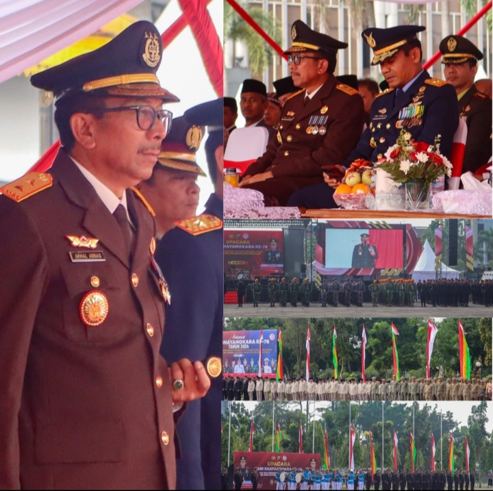 Pekanbaru - Kepala Kejaksaan Tinggi Riau Akmal Abbas, S.H., M.H menghadiri upacara dan syukuran Hari Bhayangkara ke - 78 Tahun 2024 di Halaman Kantor Gubernur Riau, Kota Pekanbaru, Provinsi Riau, Senin (01/7/2024).Upacara dan syukuran Hari Bhayangkara ke - 78 Tahun 2024 di Halaman Kantor Gubernur Riau, Kota Pekanbaru, Provinsi Riau dengan tema "Polri Presisi menuju Indonesia Emas Transformasi Ekonomi yang Inklusif dan Berkelanjutan".Adapun yang bertindak sebagai Inspektur Upacara adalah Kapolda