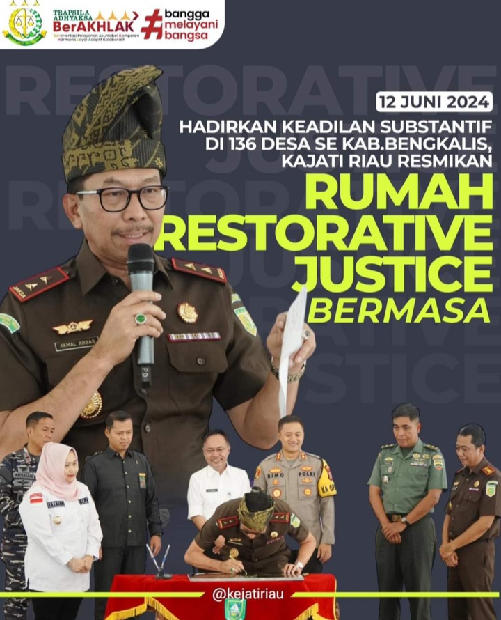 Bengkalis - Kepala Kejaksaan Tinggi Riau Akmal Abbas, SH., MH meresmikan Rumah Restorative Justice Bersama pada Desa Se-Kabupaten Bengkalis, di Balai Kerapatan Wisma Sri Mahkota Daerah Bengkalis, Rabu (12/6/2024).Kejaksaan Tinggi Riau dan Kejaksaan Negeri Se-Wilayah Riau terus berupaya hadirkan ruang keadilan di tengah masyarakat, Kepala Kejaksaan Tinggi Riau Akmal Abbas, SH., MH resmikan 136 Rumah Restorative Justice (RJ) Bermasa se Kabupaten Bengkalis bersama Bupati Bengkalis, Kajari
