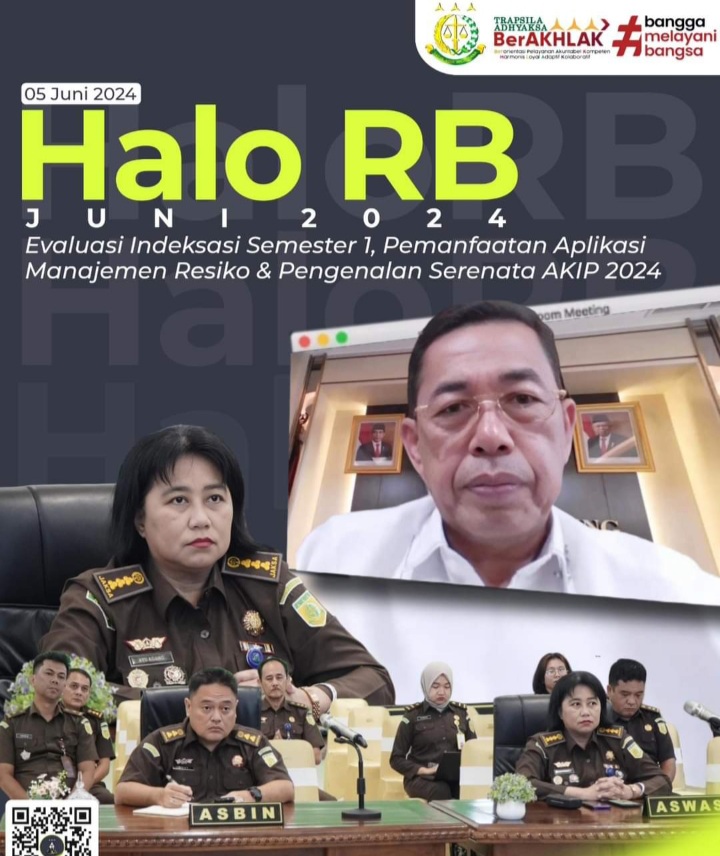 Pekanbaru - Asisten Pengawasan Kejaksaan Tinggi Riau Ayu Agung, S.H, S.Sos, M.H, M.Si (Han) didampingi Plh. Asisten Pembinaan Ricky Makado, SH., MH, Kasubagcana, Para Riksa dan Tim Kerja RB mengikuti Halo RB Juni 2024 bersama Wakil Jaksa Agung Dr. Sunarta beserta Kabag RB dan Kasubag SunProg RB secara virtual, di Ruang Vicon Lt. 2 Gedung Satya Adhi Wicaksana Kejaksaan Tinggi Riau, Rabu (05/6/2024).Dalam Halo RB bulan ini, Reformasi Birokrasi (RB) Kejaksaan menyoroti Evaluasi Pelaksaan Indeksasi