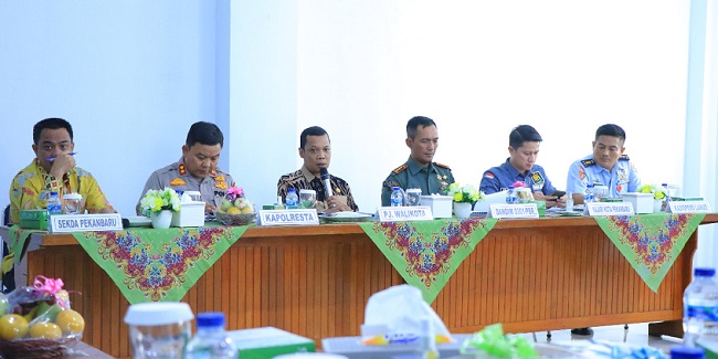 Pekanbaru - Pj Wali Kota Pekanbaru Muflihun, pimpin rapat Forkopinda di Markas Kodim 0301 Pekanbaru, Jalan Ahmad Yani, Kamis (9/6/2022).Dalam rapat tersebut, Muflihun menjabarkan terkait capaian vaksinasi Covid-19 untuk percepatan vaksinasi tercapai.Sealin mebahas covid-19, dalam rapat juga membahas terkait penanganan persoalan sampah dan penanganan banjir.Muflihun menyampaikan bahwa pemerintah kota bersama unsur forkopimda komitmen dalam upaya optimalkan penanganan sampah.Pj Walikota ini
