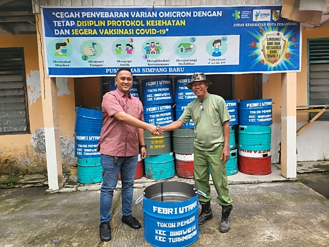 Pekanbaru - Penyerahan Bantuan Tong Sampah Dari salah satu Tokoh Pemuda Febri Utama dukung Program Pejabat (Pj) Walikota Pekanbaru Muflihun ciptakan Kota Bersih Bebas Sampah dan Banjir, Rabu (3/8/2022).Febri yang mengaku sebagai Tokoh pemuda asal Kecamatan Binawidya dan Kecamatan Tuah Madani, melakukan aksi sosial dengan membuat dan memberikan langsung Tong Sampah kepada Pemerintah di dua Kecamatan di wilayahnya."Hari ini bertempat di Kantor Kelurahan Simpang Baru Kecamatan Tampan, Kita