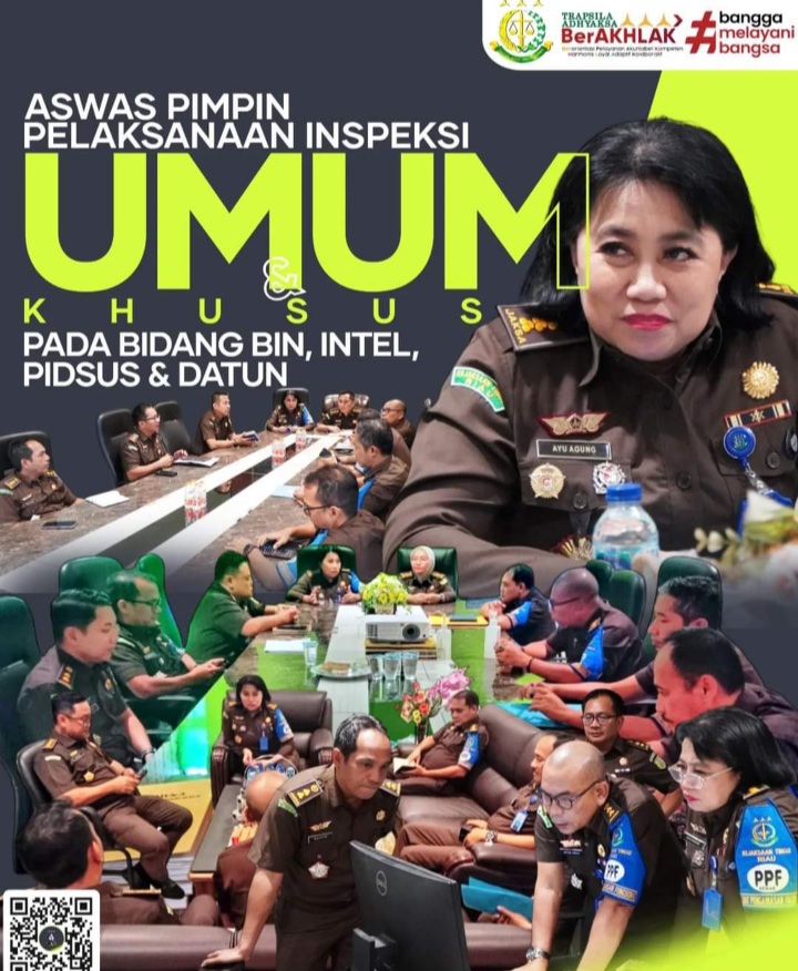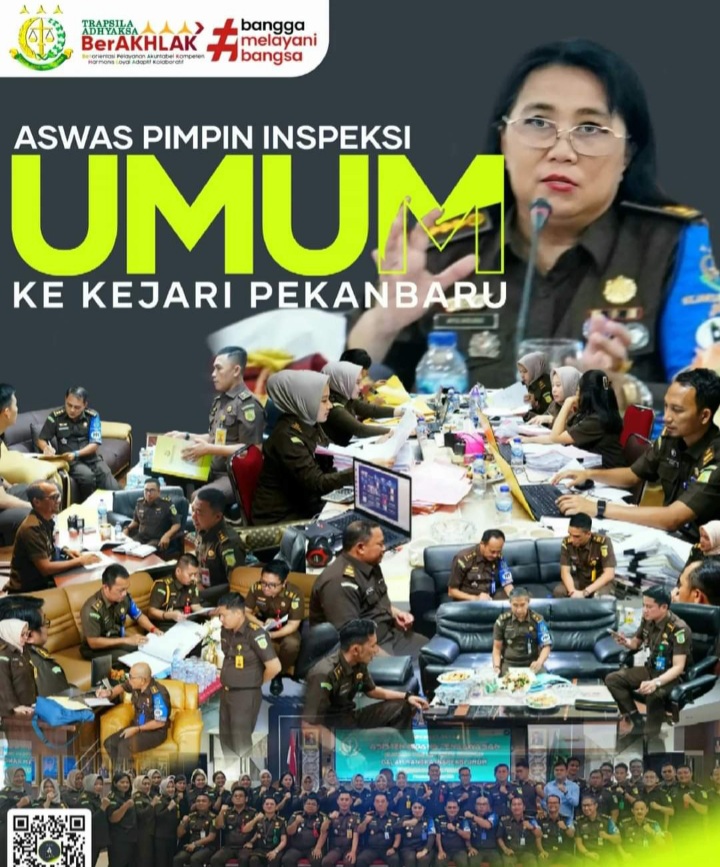 Pekanbaru - Asisten Pengawasan Kejaksaan Tinggi Riau Ayu Agung, S.H, S.Sos, M.H, M.Si (Han) melakukan Inspeksi Umum dan Khusus pada bidang Pembinaan, Intelijen, Tindak Pidana Khusus dan Perdata & TUN yang diterima langsung oleh masing-masing Asisten beserta jajaran diruang kerjanya, Senin tanggal 29 Januari 2024 sekira pukul 10.00 Wib.Dalam Inspeksi Umum dan Khusus ini dilakukan berbagai pemeriksaan menyeluruh oleh para Riksa yang melingkupi perjanjian dan target kinerja dalam tahun