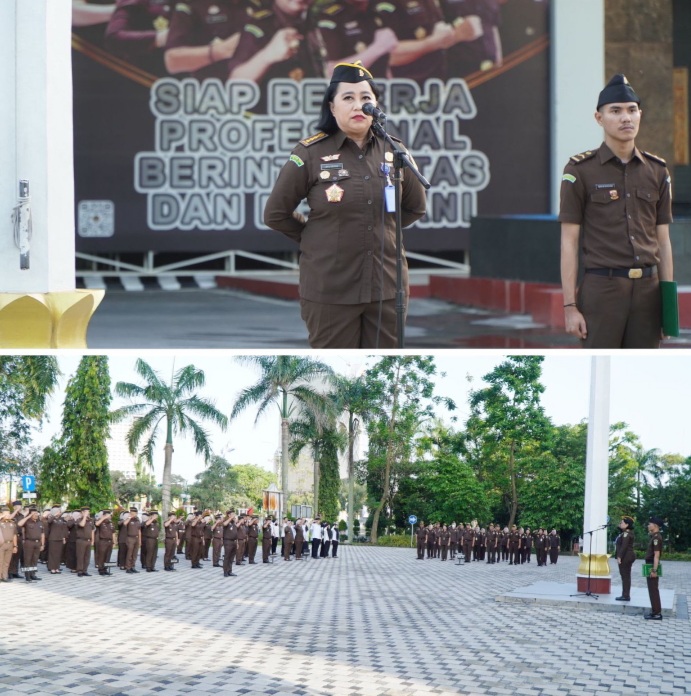 Pekanbaru - Asisten Pengawasan Kejaksaan Tinggi Riau Ayu Agung, S.H., S. Sos., M.H., M. Si (HAN) menjadi Penerima Apel Kerja Pagi Kejaksaan Tinggi Riau yang diikuti oleh Para Asisten, Para Koordinator, Para Kasi dan Jaksa Fungsional beserta seluruh Pegawai dan Honorer pada Kejaksaan Tinggi Riau di Halaman Kantor Kejaksaan Tinggi Riau, Senin (29/1/2024).Dalam amanatnya Asisten Pengawasan Kejaksaan Tinggi Riau Ayu Agung, S.H., S. Sos., M.H., M. Si (HAN) menyampaikan kepada seluruh pegawai