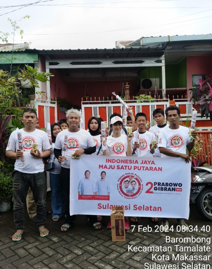 Makasar - Ratusan warga yang tergabung dalam relawan Gerakan Sekali Putaran (GSP) Sulawesi Selatan (Sulsel) menggelar kegiatan sosialisasi gerakan pilpres sekali putaran, Rabu (07/02/2024). Kegiatan difokuskan di dua kecamatan yakni Kecamatan Manggala dan Kecamatan Tallo, Kota Makassar, Provinsi Sulsel. Koordinator Provinsi GSP Sulsel, Arifin Rahim mengatakan, masyarakat Sulsel sangat antusias dan sangat senang dengan adanya kegiatan yang dilakukan relawan GSP. Sebab selain sosialisasi, relawan