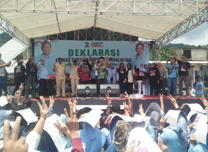 Purbalingga - Ketua Santri Deso, Slamet Wahidin menggelar Deklarasi Laskar Santri Kampung Se-Purbalingga pendukung Capres-cawapres Prabowo Gibran. Kegiatan ini diselenggarakan di halaman parkir Obyek Wisata Alam Goa Lawa (Golaga) Siwarak. Karangreja. Purbalingga, Senin Siang(5/2/2024)."Kita harus menang, kita harus berani mengatakan bahwa sudah saatnya dan selayaknya Prabowo Gibran memimpin Indonesia menang satu putaran," ucap Slamet Wahidin dalam sambutannya. Selaku pengurus nasional Suksesi