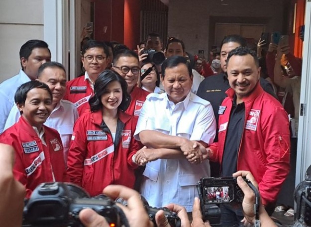 Jakarta - Kunjungan Ketum Partai Gerindra Prabowo Subianto ke markas DPP Partai Solidaritas Indonesia (PSI) di Jakarta Pusat di Kantor PSI, Tanah Abang, Jakarta Pusat, Rabu (2/8/2023).Wakil Ketua Dewan Pembina PSI Grace Natalie menyanjung Prabowo yang mau datang menemui partai yang diisi bocil-bocil ingusan."Hari ini kami keluarga besar PSI sangat berterima kasih, sangat senang sekali, kami hari ini kedatangan tamu kehormatan seorang Menteri Pertahanan, seorang calon presiden yang disebut-sebut