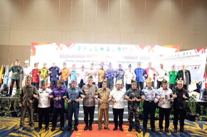 Pekanbaru - Delapan belas Partai Politik (Parpol) peserta Pemilu 2024 beserta ratusan anggotanya mengikuti Deklarasi Pemilu Damai dengan di komplek mall SKA Coex, Senin (28/8)2023).Pelaksanaan deklarasi Pemilu Damai 2024 mengangkat tema Pemilu yang bersih, aman, damai, kondusif dan berintegritas dilaksanakan serentak di seluruh Indonesia.Acara ini dihadiri langsung Kapolda Riau, Irjen M Iqbal, Wakapolda Riau Brigjen K Rahmadi, Ketua KPU Riau Ilham M Yasir, Ketua Bawaslu Riau Alnofrizal,