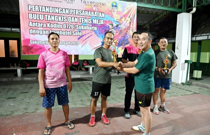 Sukoharjo - Dalam upaya meningkatkan dan menjaga kebugaran Prajurit sekaligus Pembinaan Teritorial untuk mempererat Kemanunggalan TNI-Rakyat, Kodim 0726/Sukoharjo gelar olahraga bersama dengan Tim dari Fave Hotel Solo Baru, Kec. Grogol yang berlangsung di ruangan serba guna dan Aula Makodim 0726/Sukoharjo, Jumat (23/2/2024).Cabang olah raga dipertandingkan yaitu Tenis Meja dan Bulu Tangkis yang yang diikuti oleh seluruh anggota prajurit maupun PNS Kodim 0726/Sukoharjo dan Koramil Jajaran guna