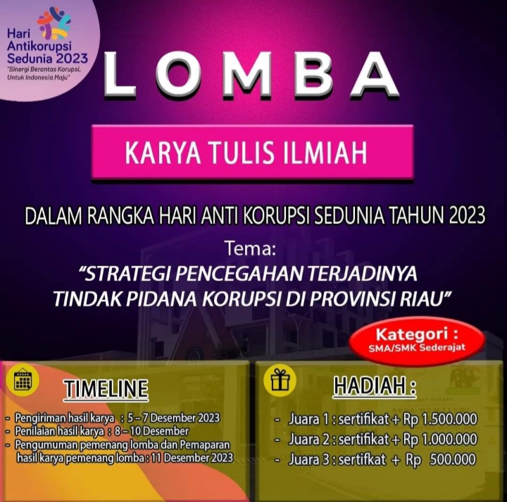Pekanbaru - Dalam rangka Hari Anti Korupsi Sedunia (HARKODIA), Kejaksaan Tinggi Provinsi Riau menggelar perlombaan karya Tulis ilmiah untuk para siswa SMK/SMA dan para Jurnalis yang tersebar di seluruh wilayah Provinsi Riau.Lomba karya tulis ilmiah yang di taja oleh Kejaksaan Tinggi Riau ini dalam rangka menggelorakan hari Anti Korupsi Sedunia.Kepala Seksi Penerangan Hukum Kejaksaaan Tinggi Riau (Kasi Penkum Kejati Riau Bambang Heripurwanto SH., MH., menyampaikan adapun kegiatan ini
