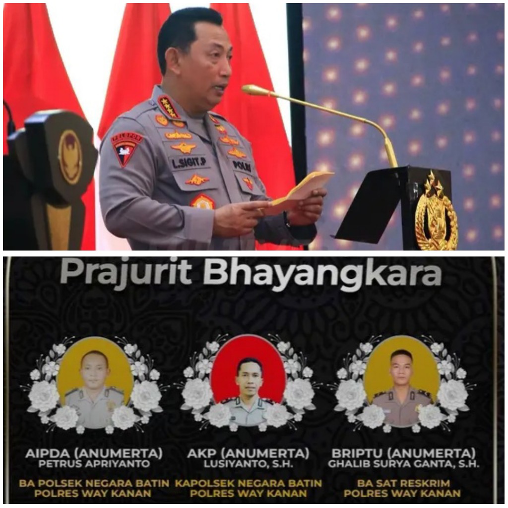 Jakarta - Polri berduka atas gugurnya tiga personel terbaik dalam pengabdian tugas di Kabupaten Way Kanan, Lampung, pada hari Senin (17/3/2025).Ketiganya adalah Kapolsek Negara Batin Way Kanan, Iptu Lusiyanto, serta dua anggotanya, Bripka Petrus Apriyanto dan Bripda M Ghalib Surya Ganta. Ketiga jenazah korban telah dievakuasi di RS Bhayangkara Polda Lampung untuk proses autopsi. Insiden yang mengakibatkan gugurnya tiga personel Korps Bhayangkara itu bermula saat ketiganya melakukan penegakan