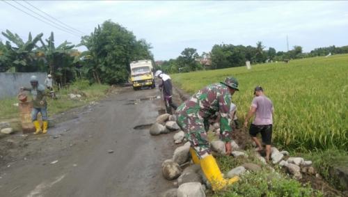 Kepedulian Babinsa Koramil 08 Bontonompo Bersama Warga Gotong Royong Perbaiki Tanggul Jalan
