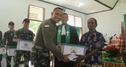 Menjelang Purna Tugas, Satgas Yonif 623 Ibadah Bersama Masyarakat Bagikan Alkitab dan Sembako